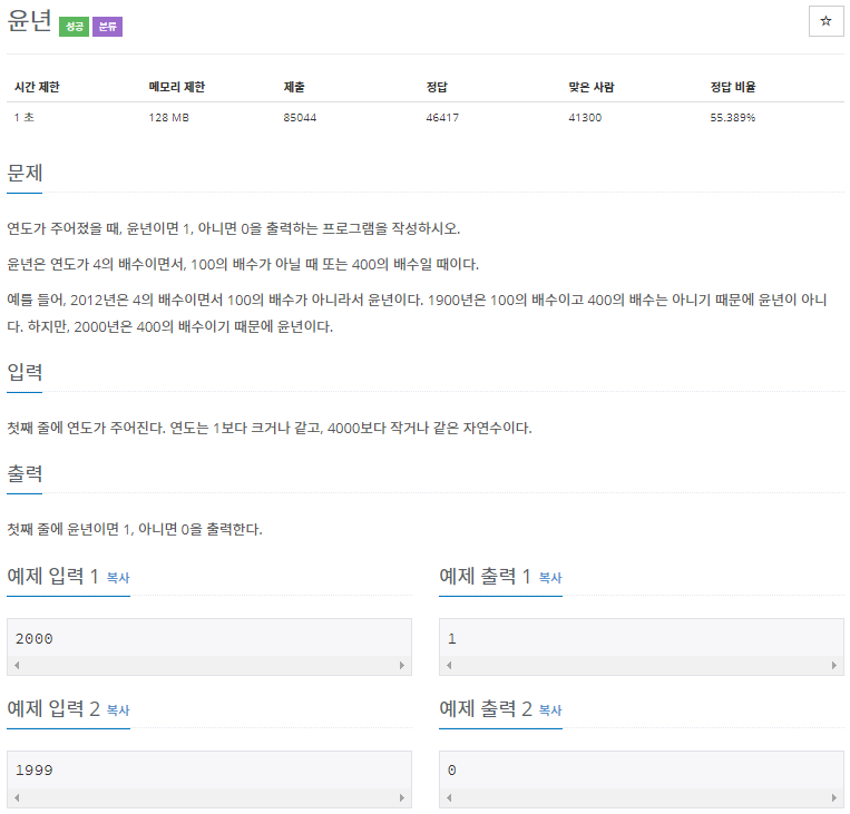 ● 출력 : 첫째 줄에 윤년이면 1, 아니면 0을 출력한다.